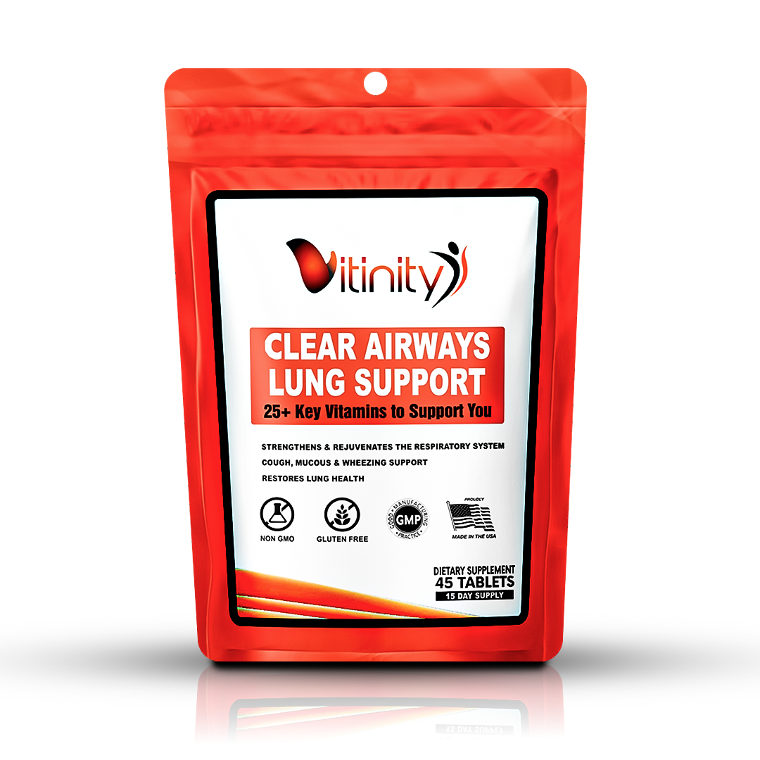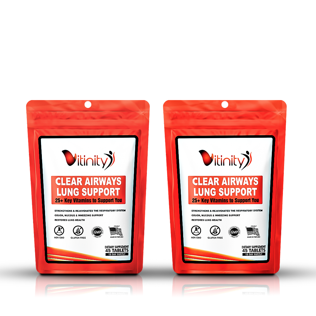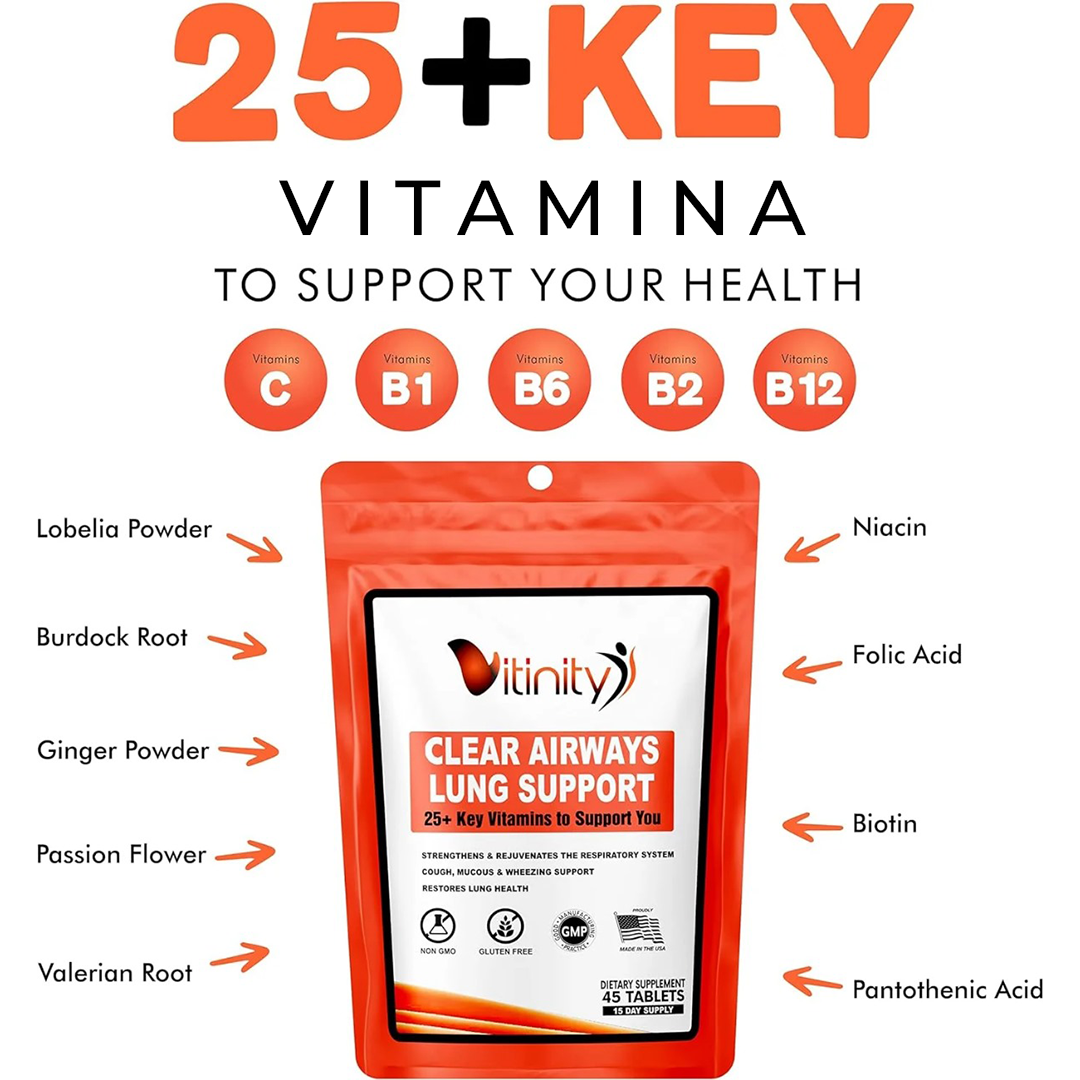 Vitinity Clear Airways Lung Support & Respiratory Health Multivitamin is a supplement specifically created to provide your body the blend of vitamins, minerals and nutrients needed to support the health of your lungs.